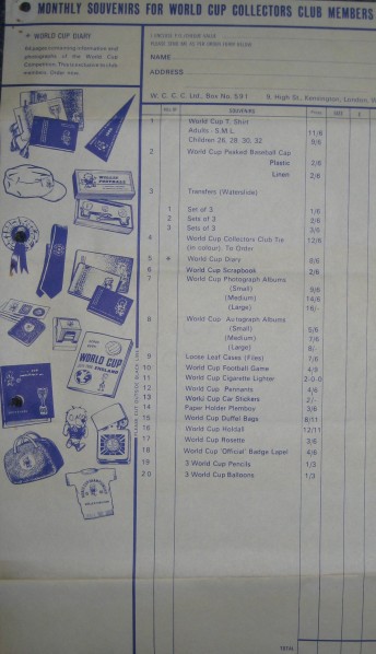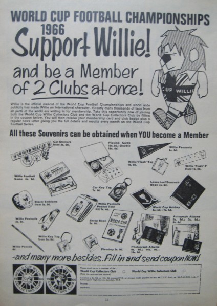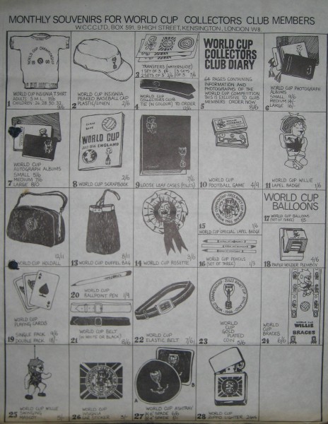The World Cup Willie Collectors Club ran alongside the World Cup Collectors Club. Members would receive a regular newsletter on headed paper, a badge made by Plastoid and a membership card. Also included were sales sheets offering exclusive merchandise.