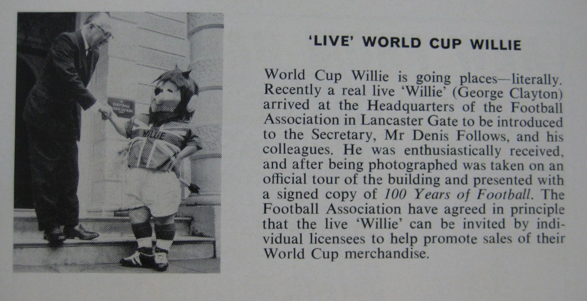 As part of the promotional campaign the Football Association came up with the idea of a real live World Cup Willie. For the part they chose the actor George Claydon who was one of the most prominent actors with dwarfism in the UK.